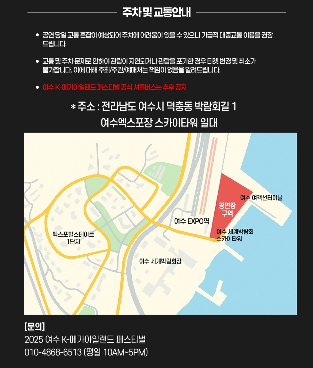 - 공연장 주소: 전남 여수시 덕충동 박람회길 1 (여수엑스포 스카이타워 일대)